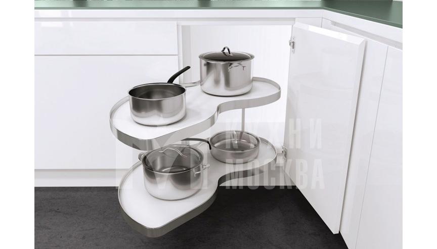 Полки изящной формы синхронно и полностью выезжают из угловой тумбы.
