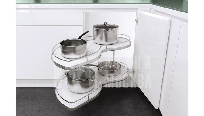Полки изящной формы синхронно и полностью выезжают из угловой тумбы.
